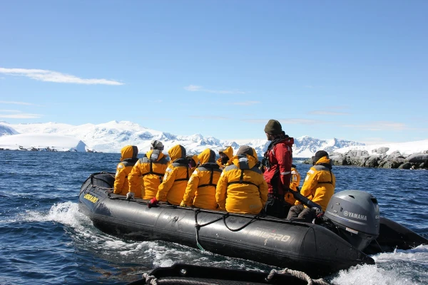 上陸していないお客様はゾディアッククルージングに出発することができます。クルージングでは海から野生動物や氷山を間近で見学することができ、探検船からの眺めとは違う、海面からの視点でダイナミックな観光を楽しむことができます。