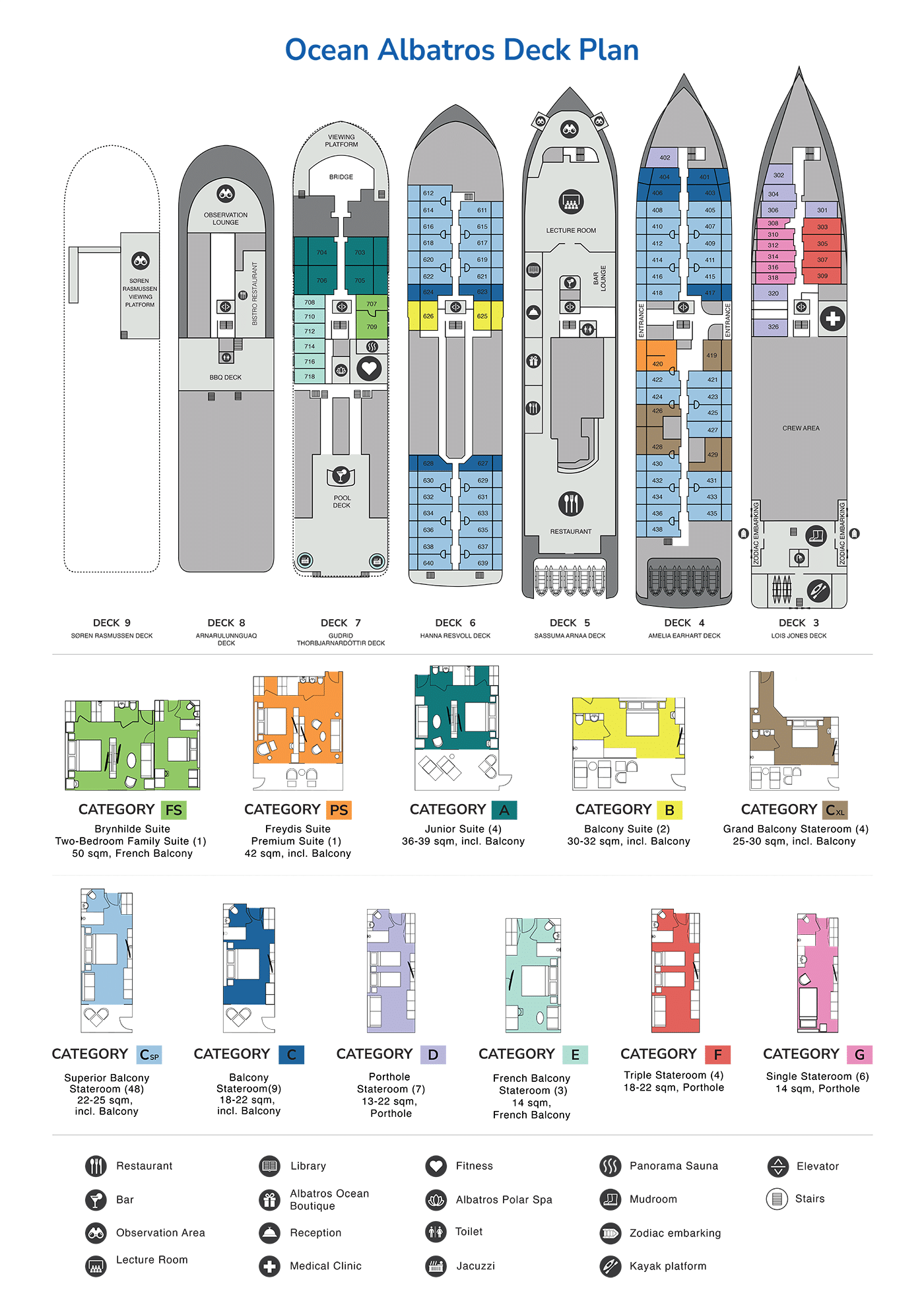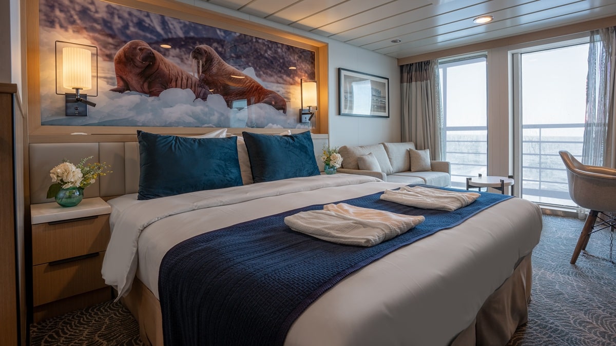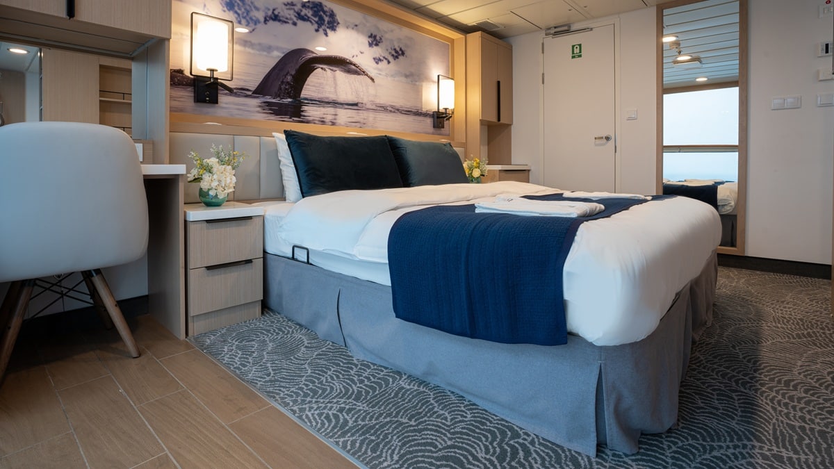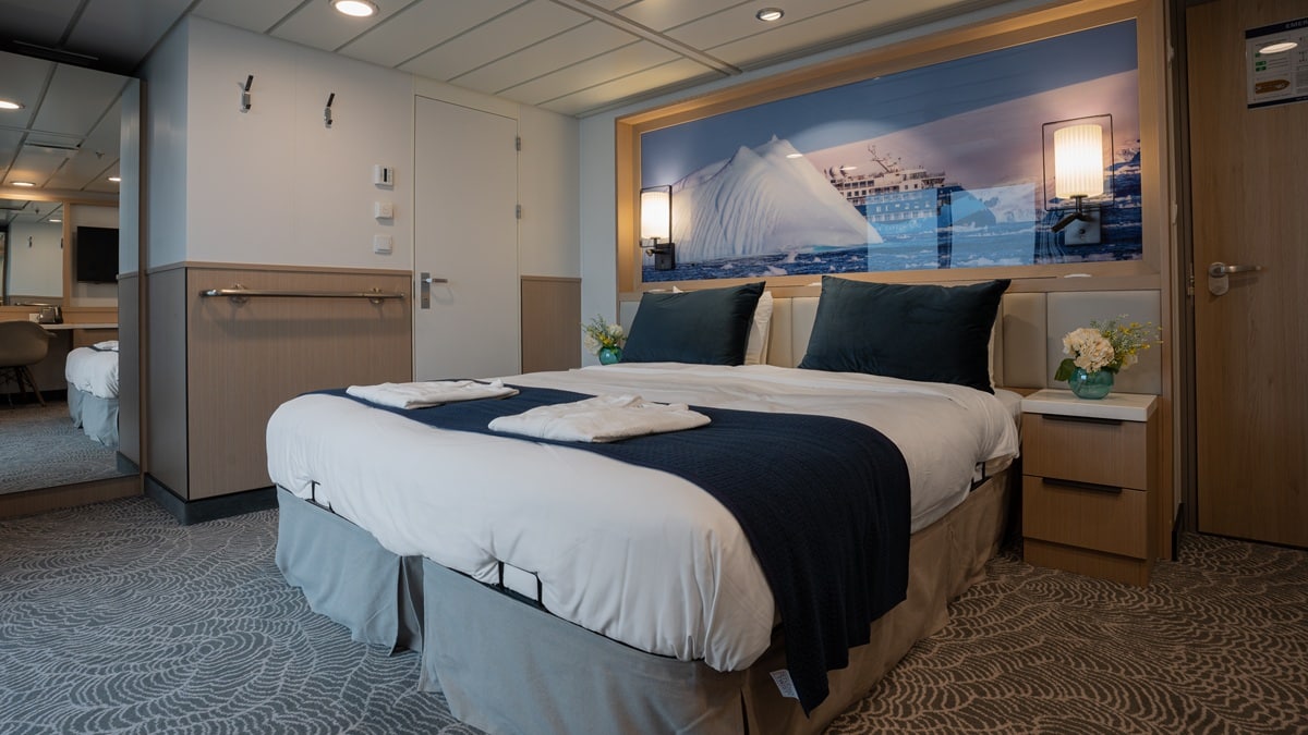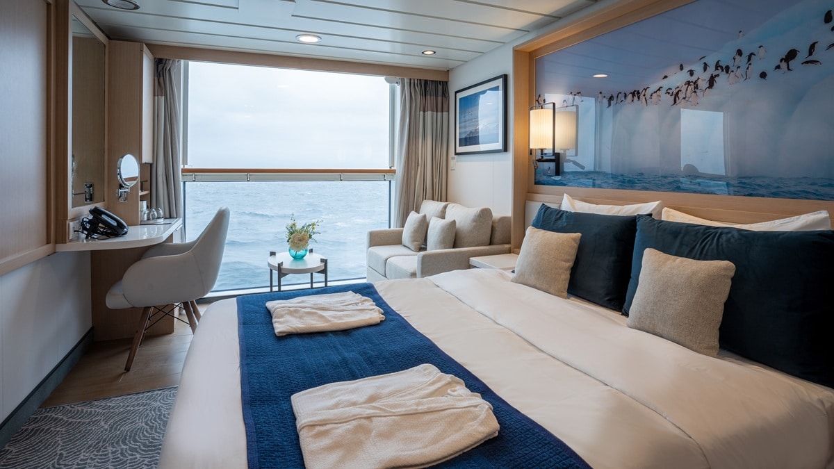 合計 94 室の快適な客室は、すべての客室から視界が遮られない景色が望め、そのほとんどに専用バルコニーが付いています。間違いなく世界で最も人気のある探検クルーズ船のひとつです。オーシャンヴィクトリーと同様に、レストラン2ヶ所、ウェルネスエリア、ノルディックバー、オープンデッキのダイニング施設、モダンなレクチャーラウンジ、その他の最先端の設備を備えています。この船は従来の探検船よりも二酸化炭素排出量を50%以上削減し、最も環境に優しい船のひとつであり、グリーンイニシアチブ・プログラムを導入し、お客様に絶対的な快適さと持続可能性の両方をお約束します。オーシャンヴィクトリーとは異なり、オーシャンアルバトロスには、ユニークなパノラマサウナや、追加料金不要のお1人様専用の客室も用意されています。