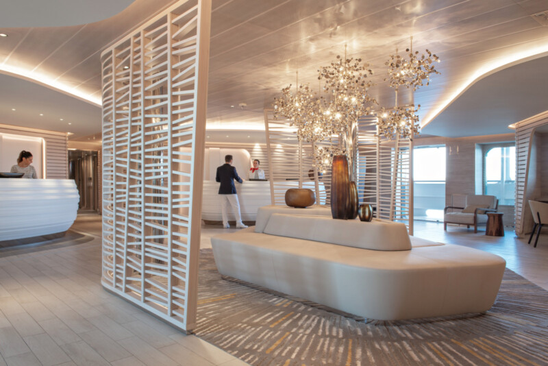 船内インテリアはフランス人デザイナーによるスタイリッシュなデザイン。ピエールフレイのファブリックがラグジュアリーな印象です。南仏フラゴナールのフレグランスが船内に香ります。